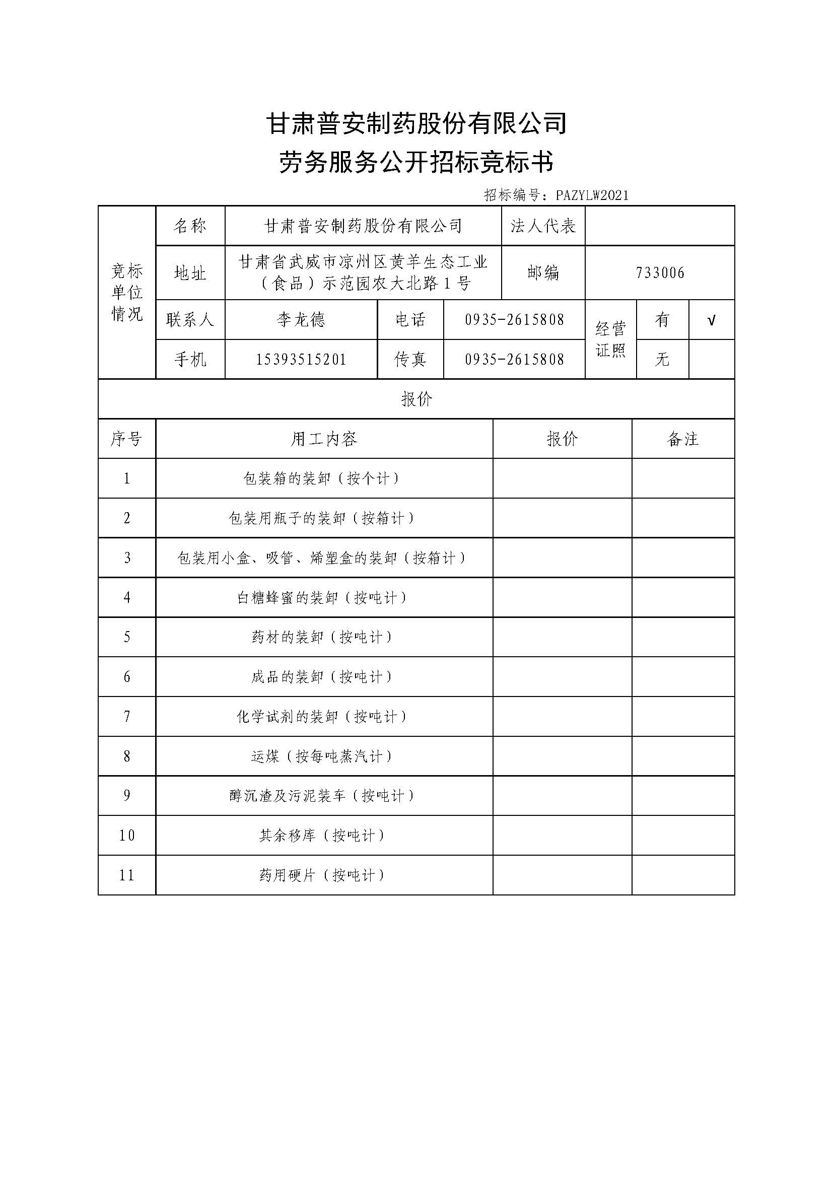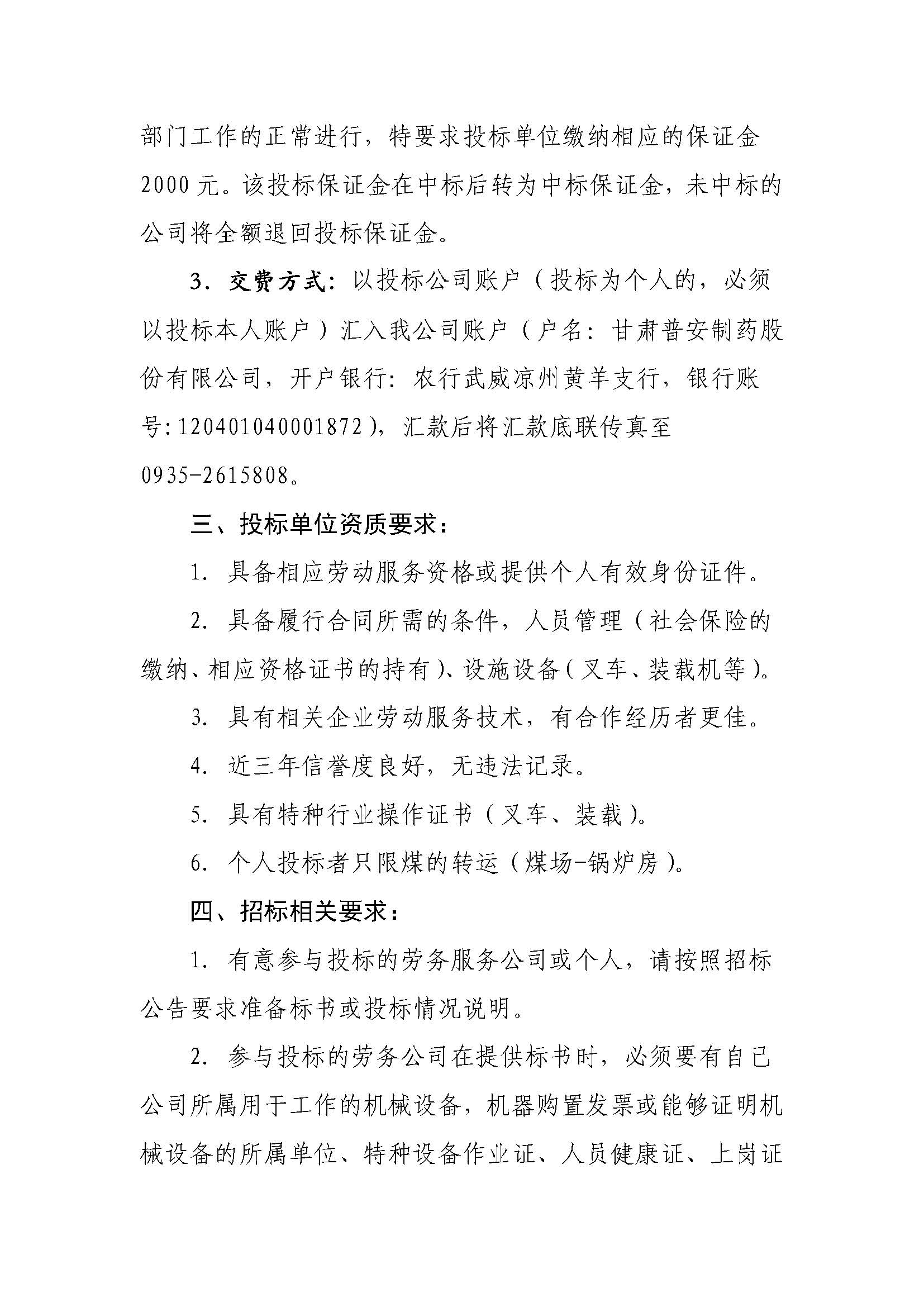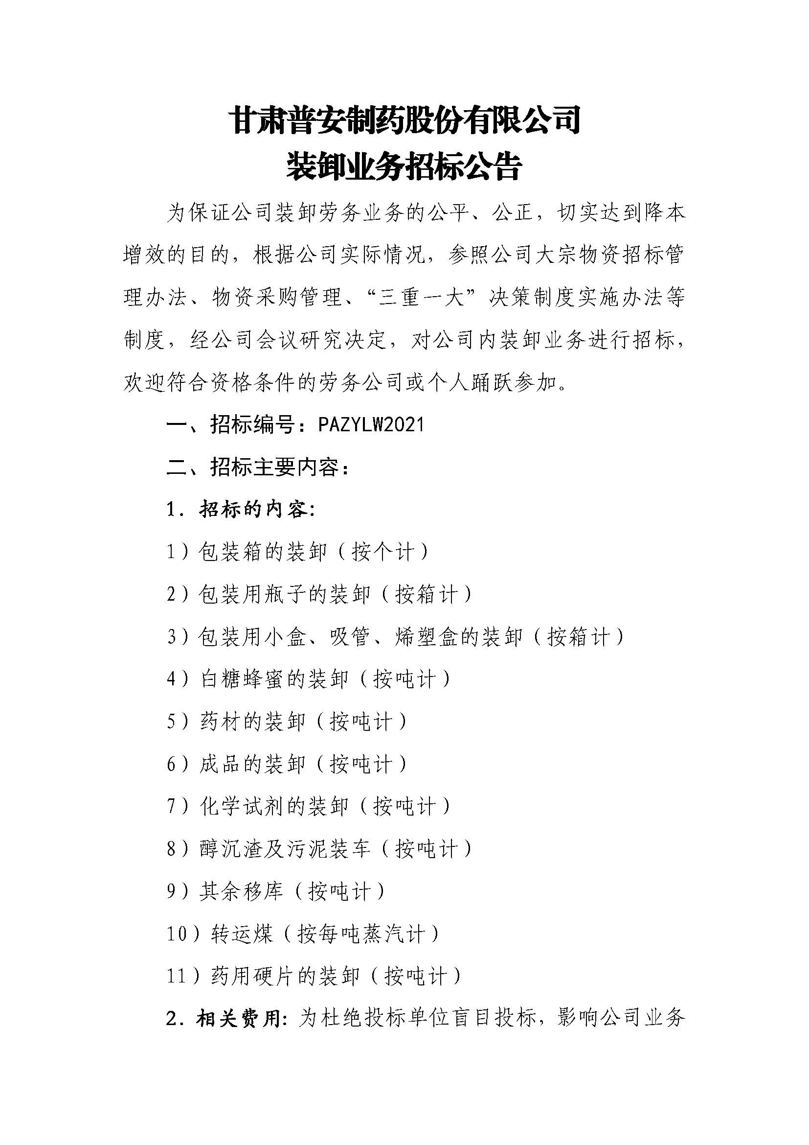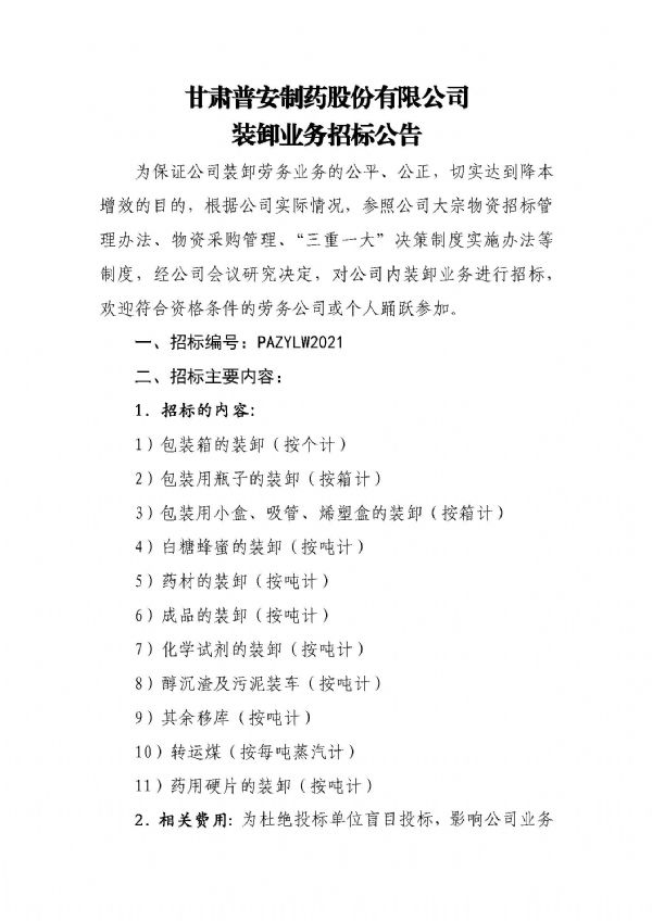 甘肅普安制藥股份有限公司裝卸業務招標公告