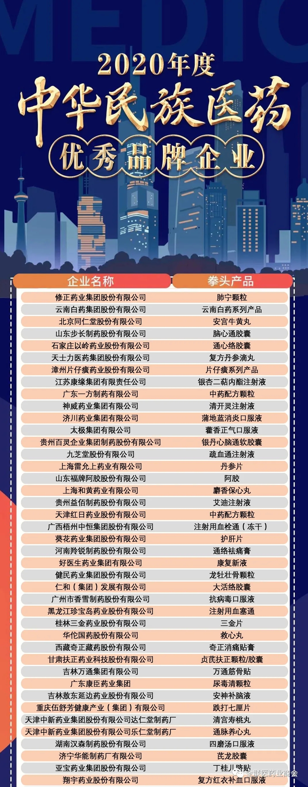 全國工商聯醫藥業商會通過企業申報、地方工商聯推薦、各專業分會信息匯總以及網絡數據分析等途徑,經過秘書處統計整理,綜合市場銷售額、行業占比、品牌認知、科技創新、國際化程度以及企業專精特新的特點等因素,報評審委員會評選出“2020 年度中華民族醫藥優秀品牌企業”。本次評選,旨在弘揚民族醫藥、打造民族品牌,樹立行業標桿、發揮榜樣作用、促進民族醫藥產業健康發展。