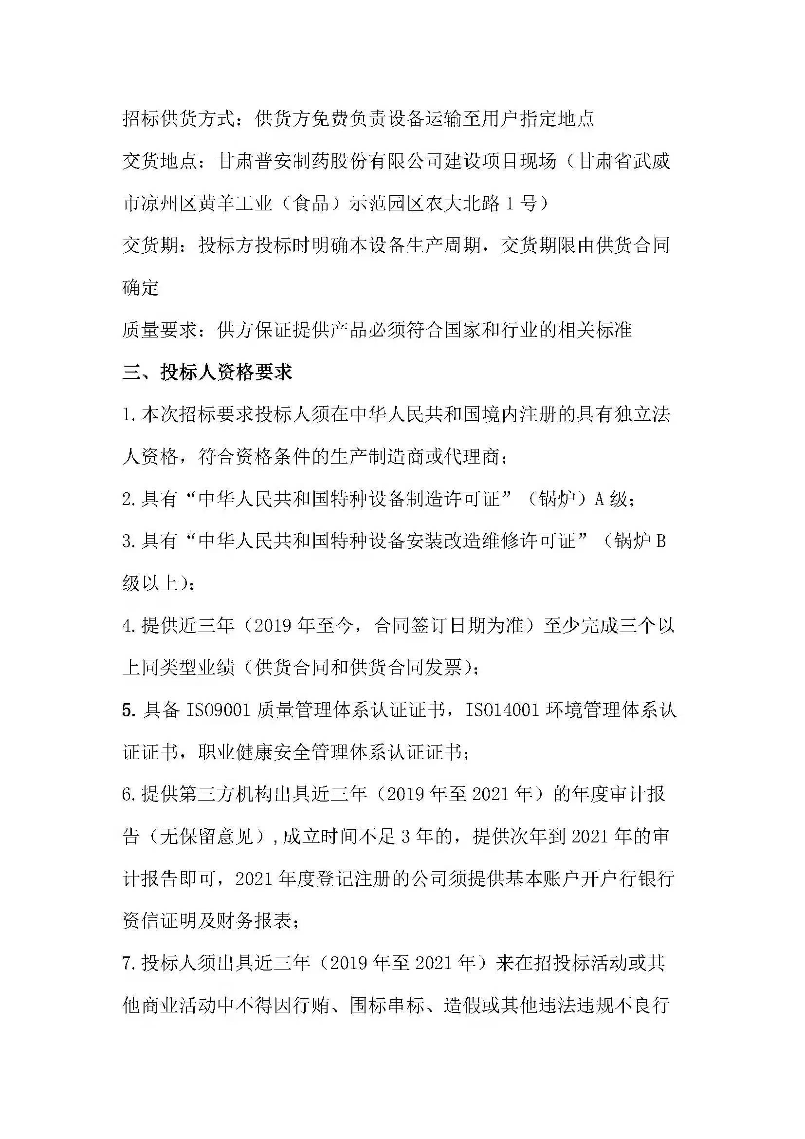 甘肅普安制藥股份有限公司15T/h鍋爐建設(shè)項(xiàng)目鍋爐設(shè)備采購招標(biāo)公告