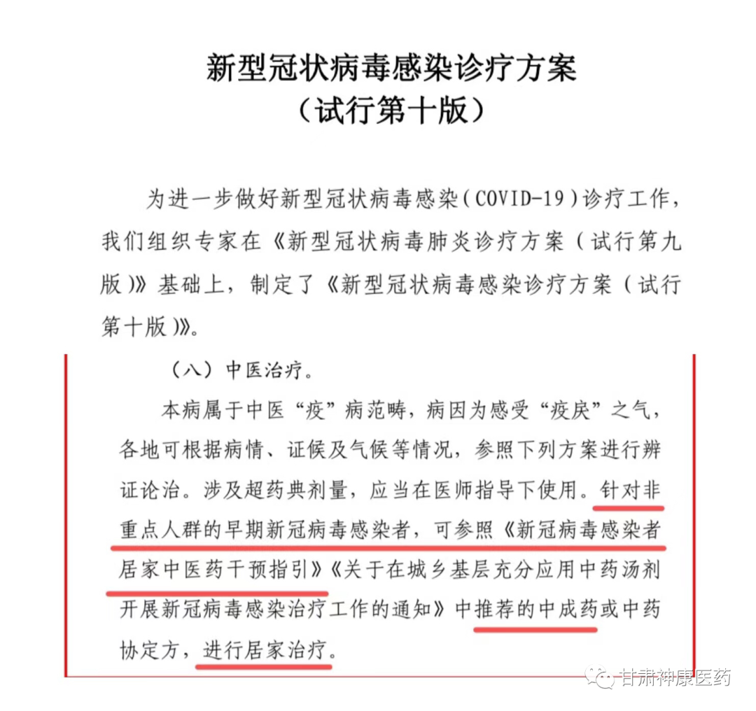 1月5日國家衛(wèi)生健康委辦公廳、國家中醫(yī)藥局綜合司發(fā)布的《新型冠狀病毒感染診療方案(試行第十版)》,在中醫(yī)治療部分,明確提出針對非重點人群的早期新冠病毒感染者,可參照《新冠病毒感染者居家中醫(yī)藥干預(yù)指引》《關(guān)于在城鄉(xiāng)基層充分應(yīng)用中藥湯劑開展新冠病毒感染治療工作的通知》中推薦的中成藥或中藥協(xié)定方,進行居家治療。