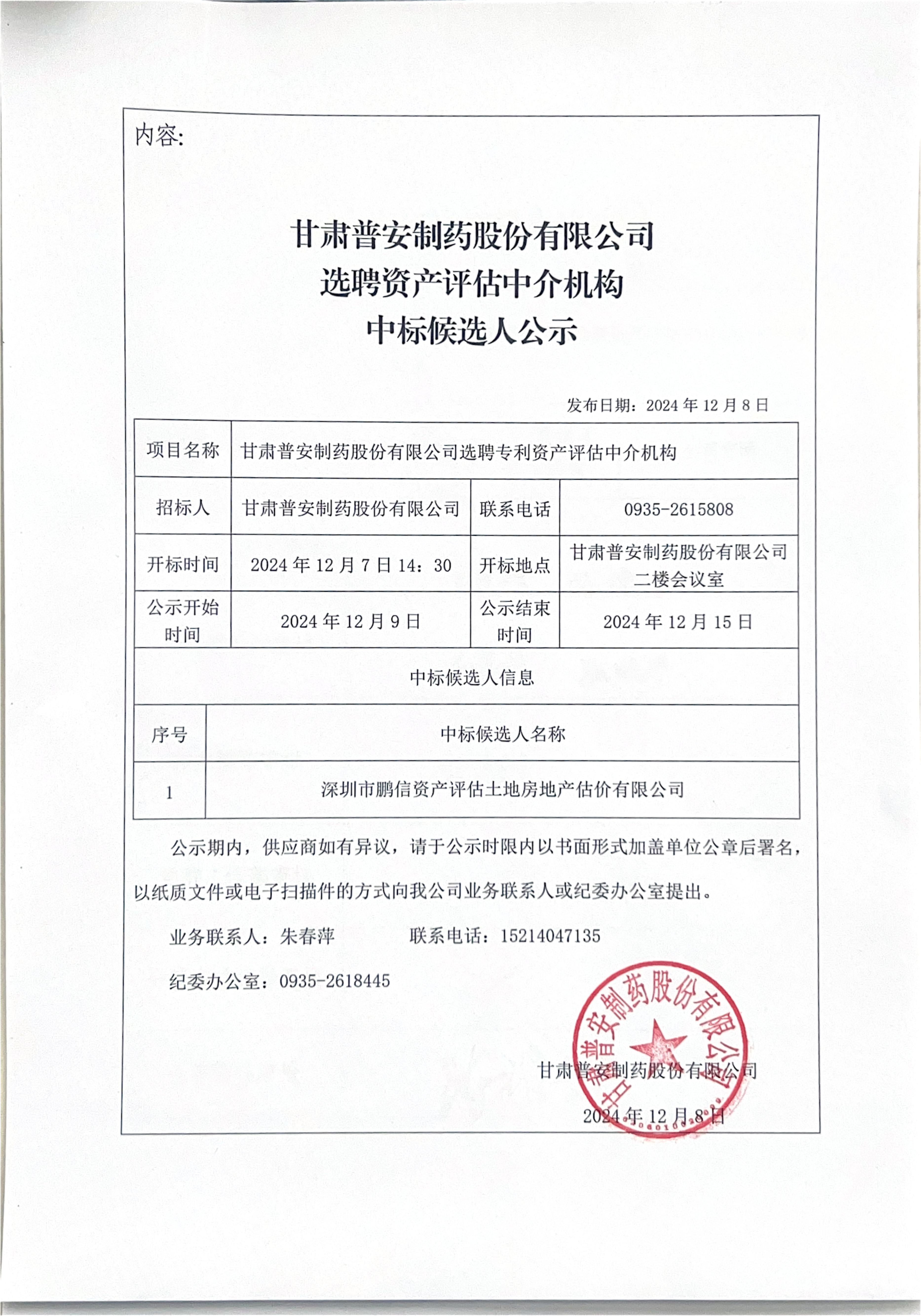 甘肅普安制藥股份有限公司選聘資產評估中介機構中標候選人公示