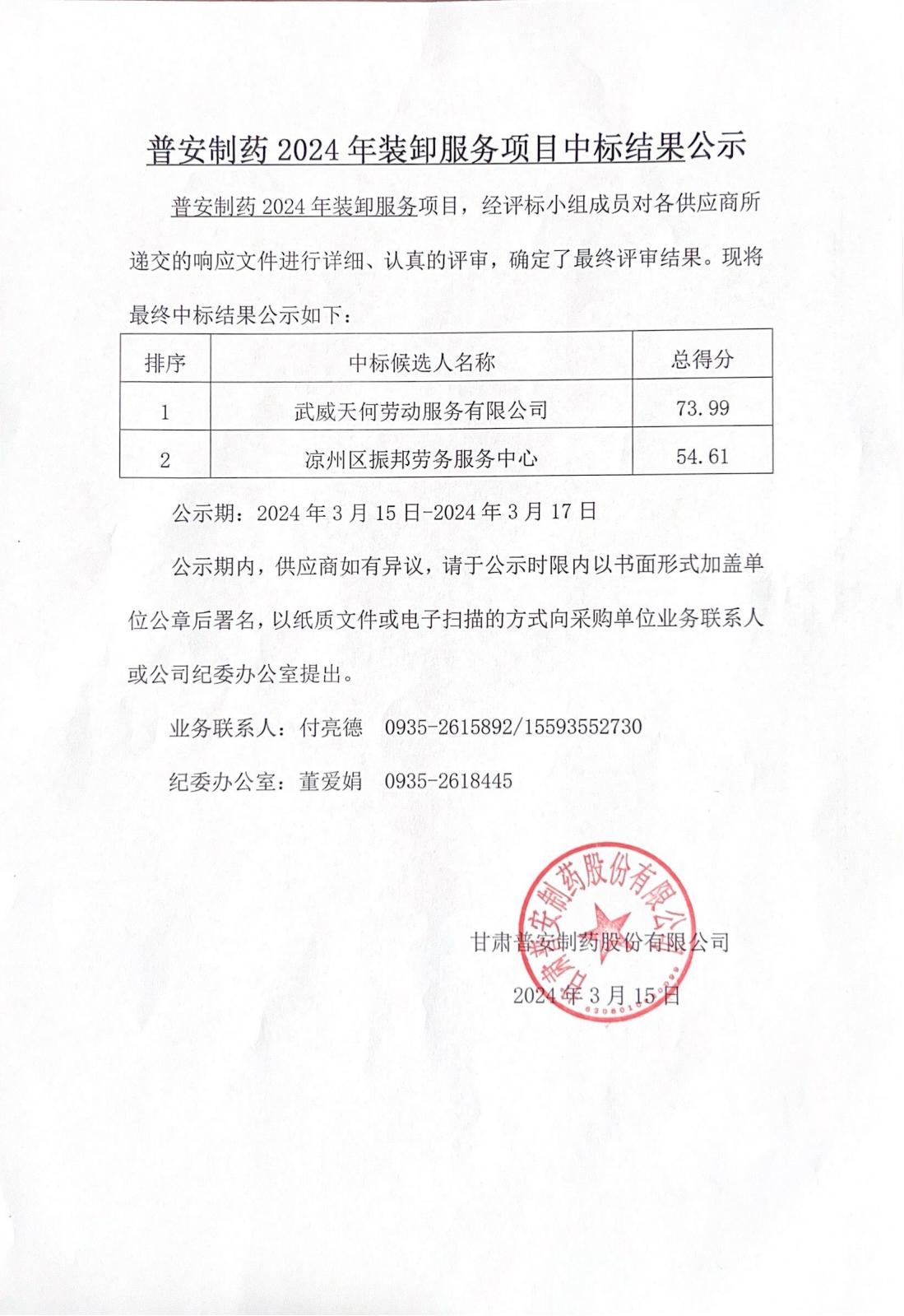 普安制藥2024年裝卸服務(wù)項目中標(biāo)結(jié)果公示
