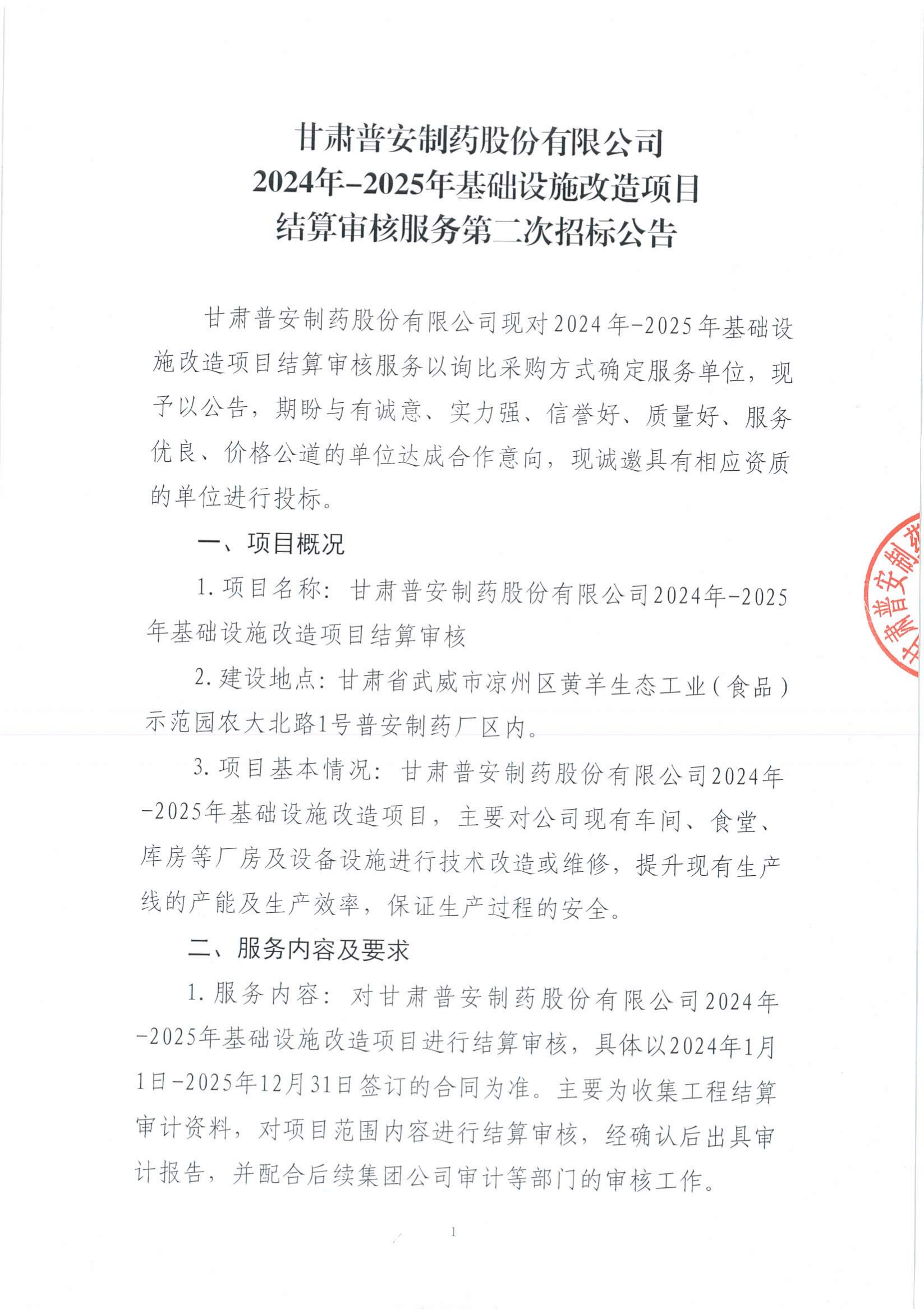 甘肅普安制藥股份有限公司2024年-2025年基礎(chǔ)設(shè)施改造項(xiàng)目結(jié)算審核服務(wù)第二次招標(biāo)公告