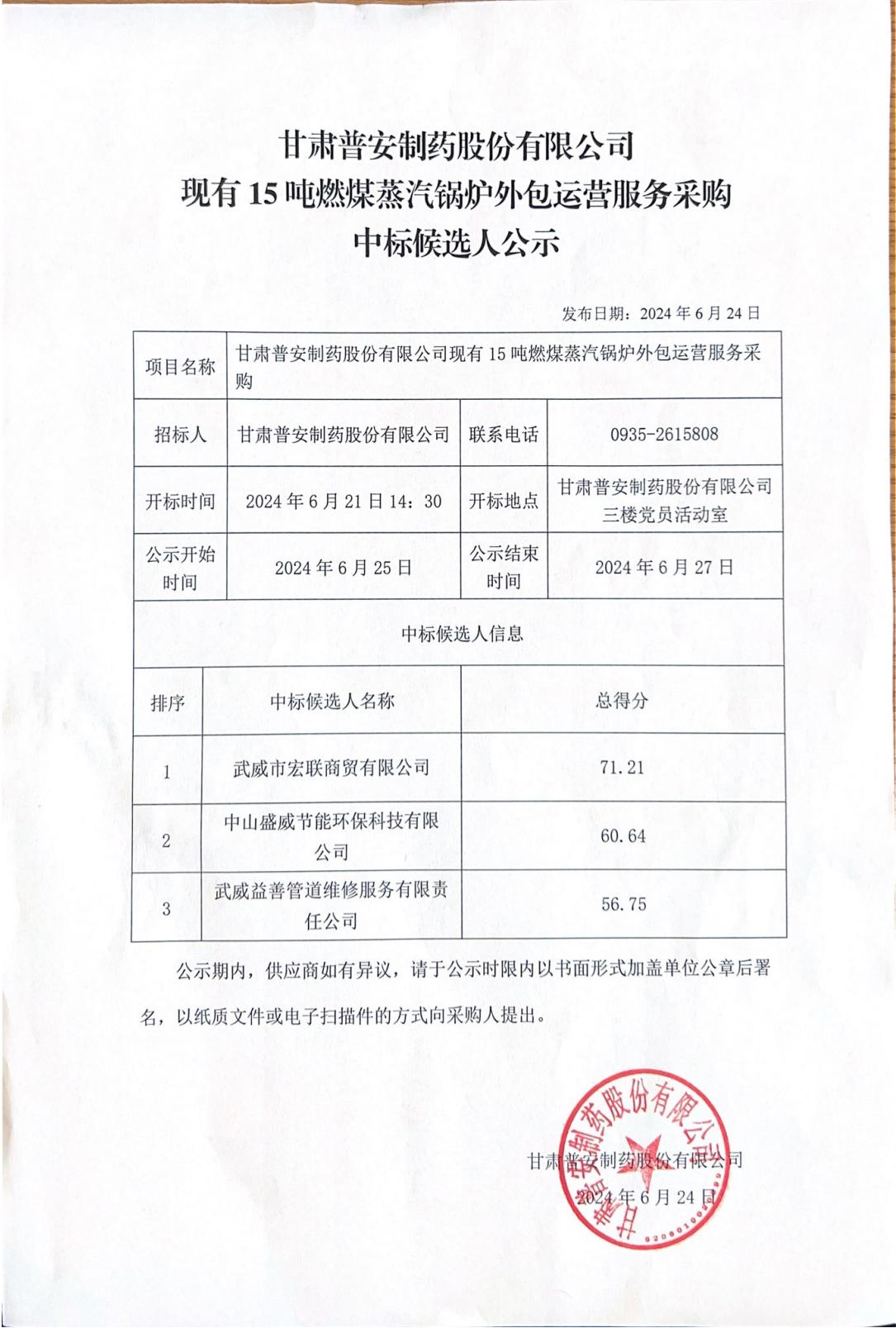 甘肅普安制藥股份有限公司現有15噸燃煤蒸汽鍋爐外包運營服務采購中標候選人公示