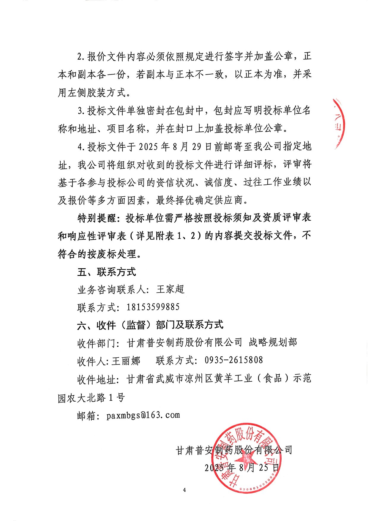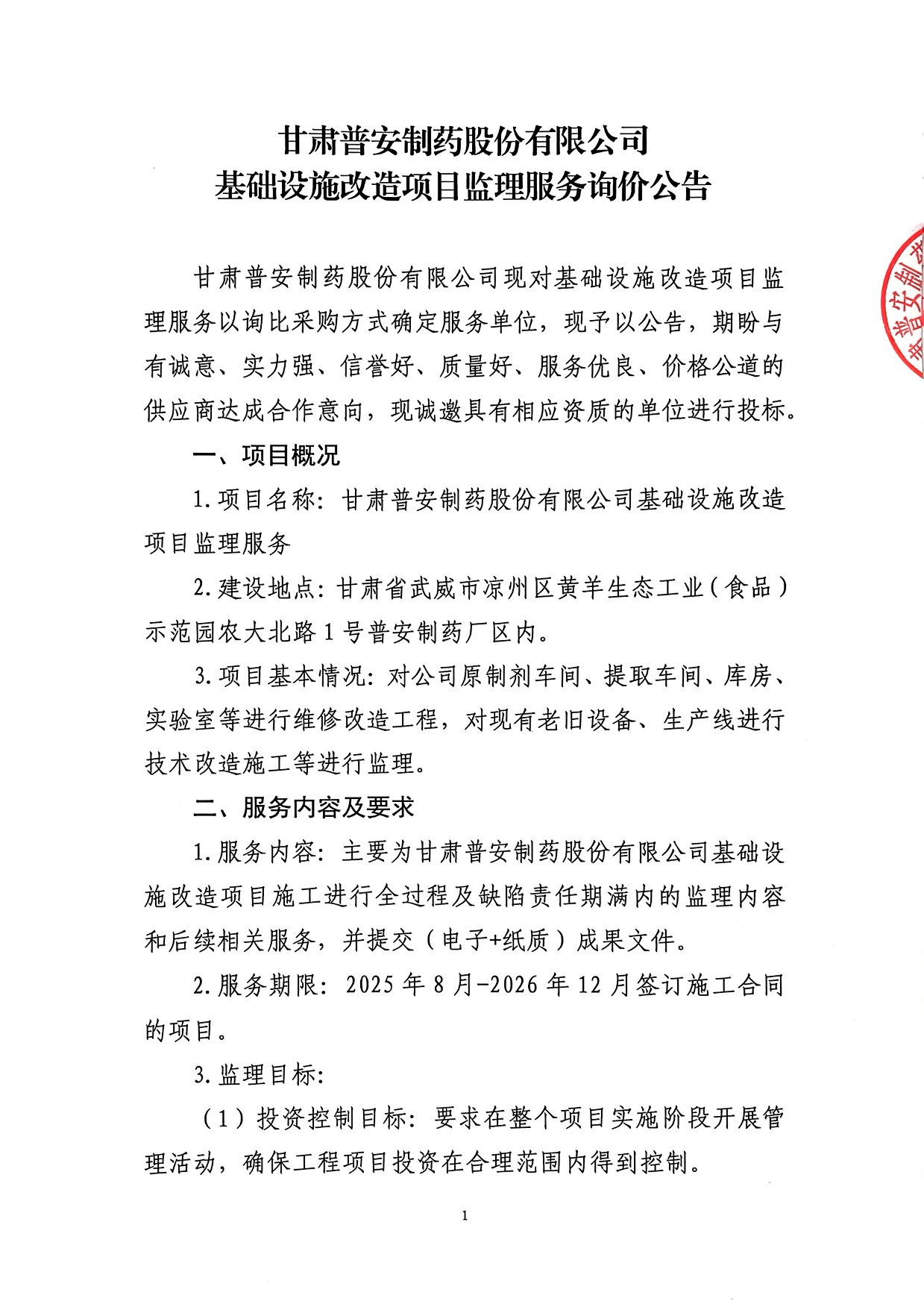 甘肅普安制藥股份有限公司 基礎(chǔ)設(shè)施改造項目監(jiān)理服務(wù)詢價公告