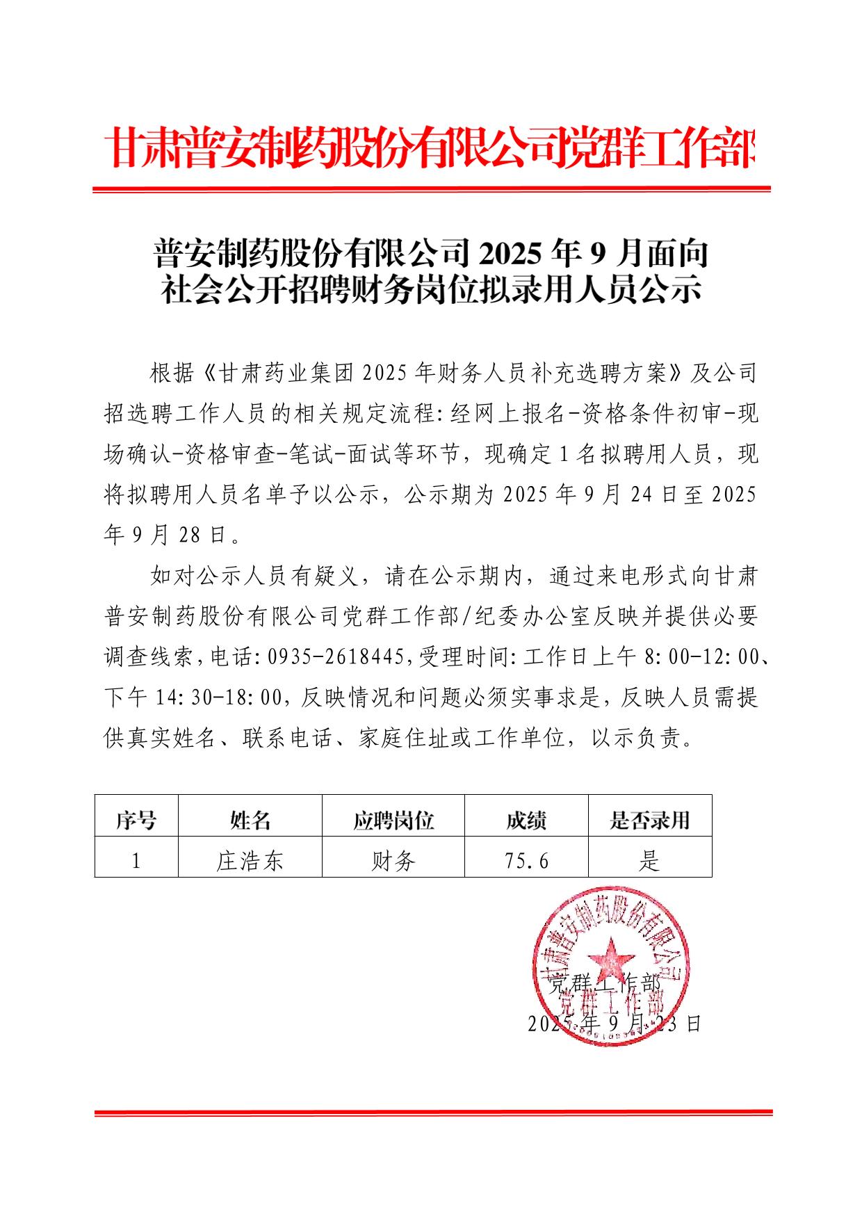 普安制藥股份有限公司2025年9月面向社會(huì)公開(kāi)招聘財(cái)務(wù)崗位擬錄用人員公示